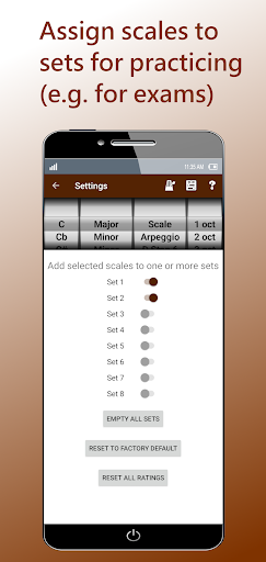 You can allocate scales to sets for practicing (e.g. for exam board grades) and you can select a random scale from any set or from all the scales to simulate exam conditions.